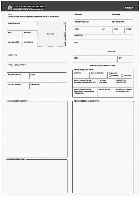 2) A versão impressa contém o mesmo leiaute do CRLV-e, em tinta preta, em página única, papel sulfite branco e formato A4.