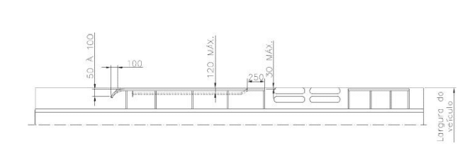 3.1 O protetor lateral não deve ultrapassar o plano correspondente à largura do veículo. A parte principal da superfície exterior do protetor lateral não deve estar a mais de 120 mm para dentro do plano correspondente à largura do veículo. A extremidade frontal deve ser dobrada para dentro, entre 50 mm e 100 mm, nos primeiros 100 mm (ver Figura 1). As extremidades do protetor lateral, nos últimos 250 mm próximos aos pneus, devem estar no máximo a 30 mm para dentro em relação ao plano correspondente a largura do veículo ou, quando não houver esta referência, 30 mm à face externa do pneu medido na altura do protetor lateral (ver Figura 1). Quando a cabina do veículo for mais larga que a carroçaria, deve prevalecer a largura da carroçaria.