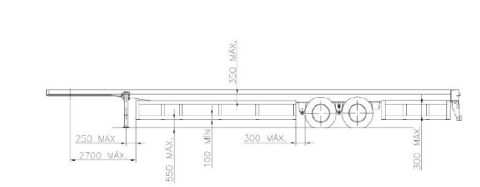 c) em um semi-reboque, não mais do que 250 mm para trás do plano transversal médio do suporte vertical, se ele estiver presente, mas em nenhum caso a distância entre a aresta frontal do protetor lateral e um plano transversal que passe pelo centro do pino-rei, quando este estiver em sua posição mais traseira, deve ser maior do que 2 700 mm (ver Figura 3).