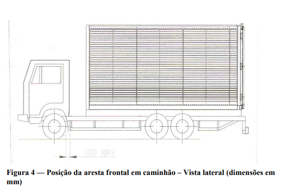3.4.3 Em um caminhão no qual a dimensão de 300 mm, definida em 4.4a), interfira na cabina e a folga entre a aresta frontal do protetor lateral e os painéis da cabina for menor do que 100 mm por opção do fabricante, os requisitos de 3.4.2 devem ser atendidos.