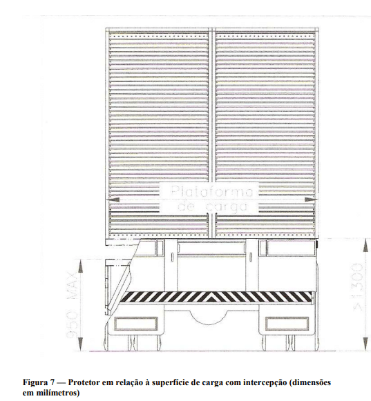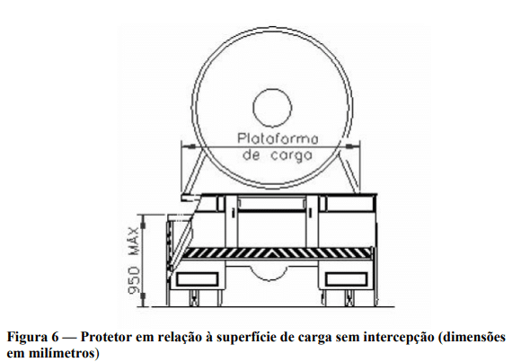 3.8.1 Quando o plano vertical tangente à superfície externa do protetor lateral não interceptar a estrutura do veículo, a borda superior deve estar ao nível da superfície de carga ou a 950 mm de altura em relação ao solo, prevalecendo a dimensão menor, medido com o veículo com sua massa em ordem de marcha (ver Figura 6).